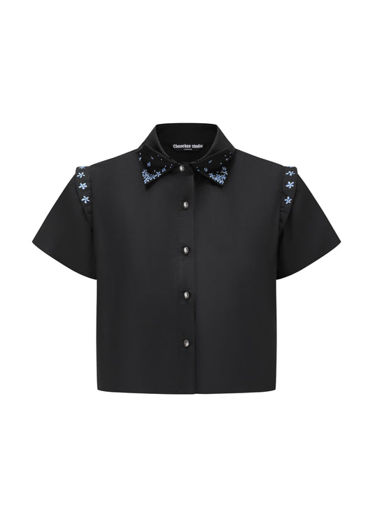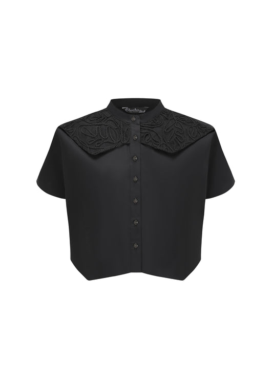 French Silk Ribbon Embroidery cropped Shirt - Black