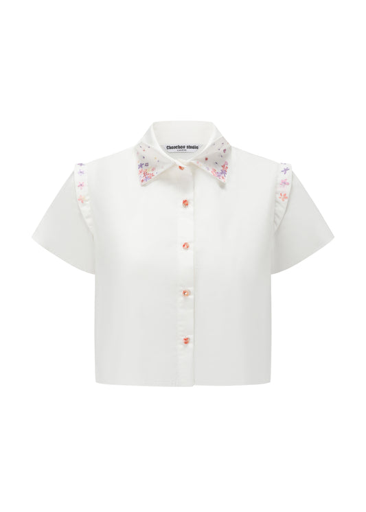 French Silk Ribbon Embroidery cropped Shirt - White