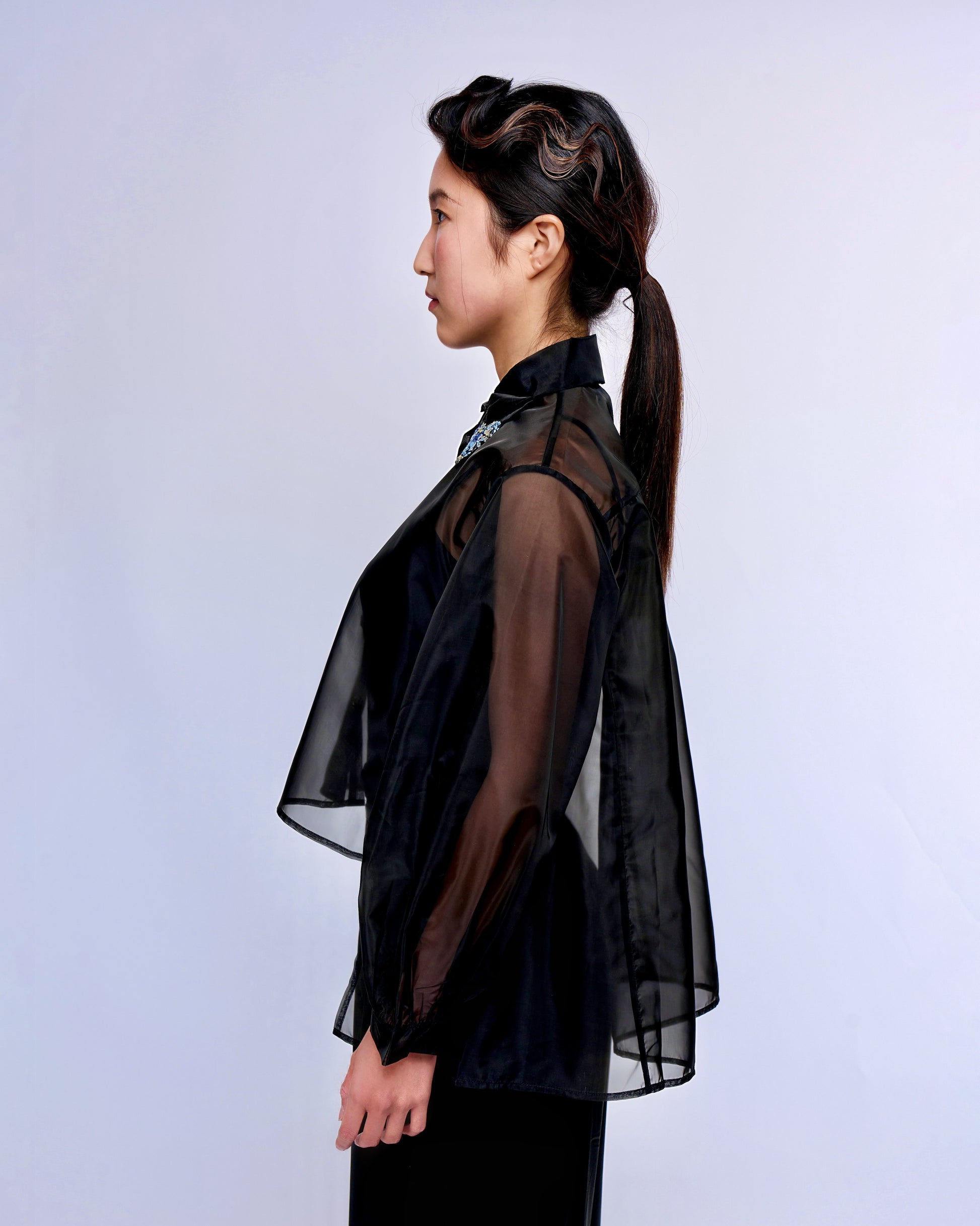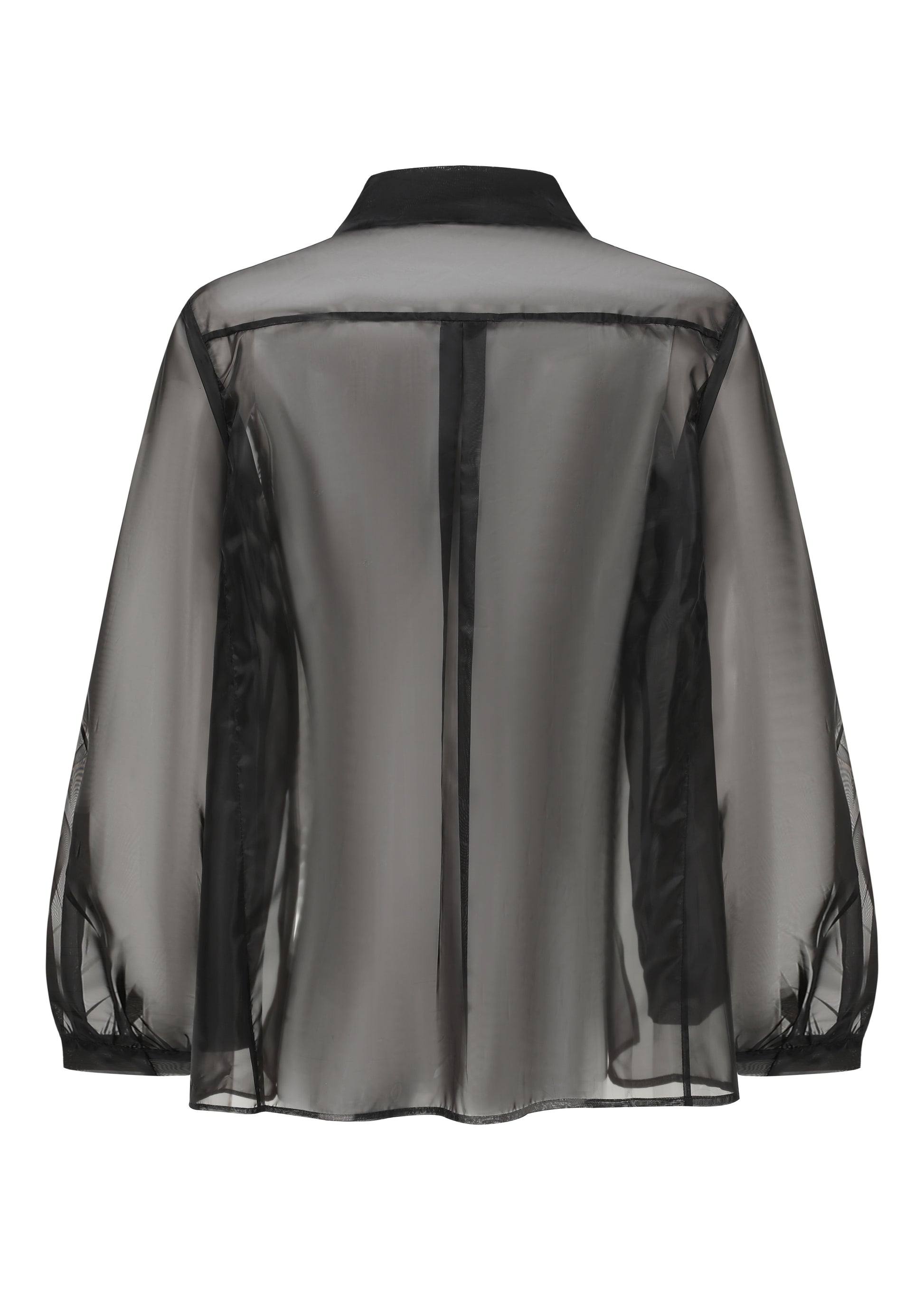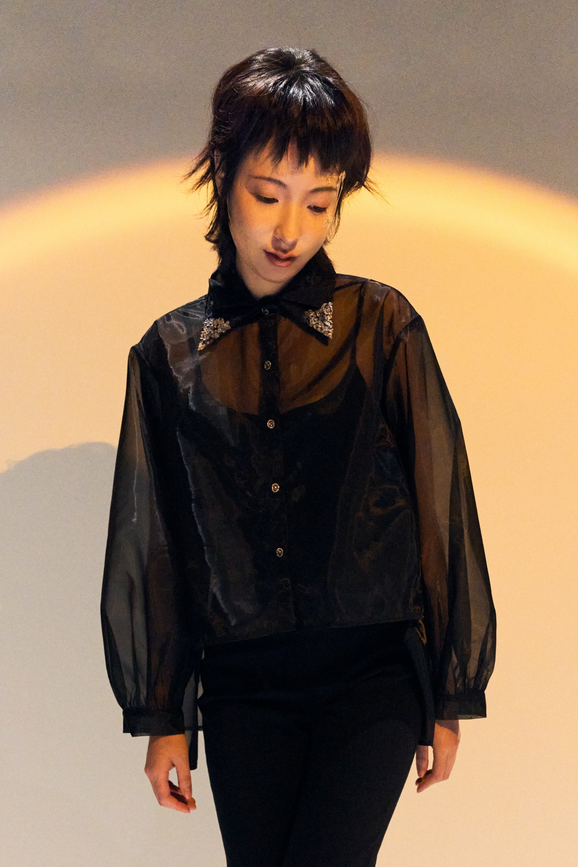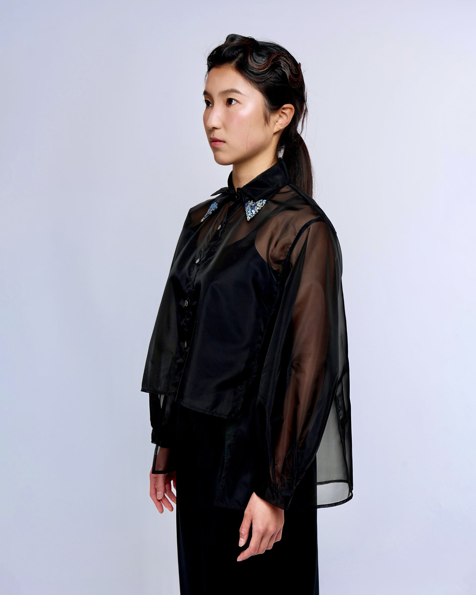 This shirt features a modern silhouette with a slightly cropped front and a longer back, creating a flattering and dynamic look. The voluminous sleeves with gently gathered cuffs contribute to the blouse's romantic silhouette, making it an ideal piece for those who appreciate a combination of modern design and timeless craftsmanship. Perfect for both casual and formal settings, this organza blouse is a versatile addition to any fashion-forward collection.