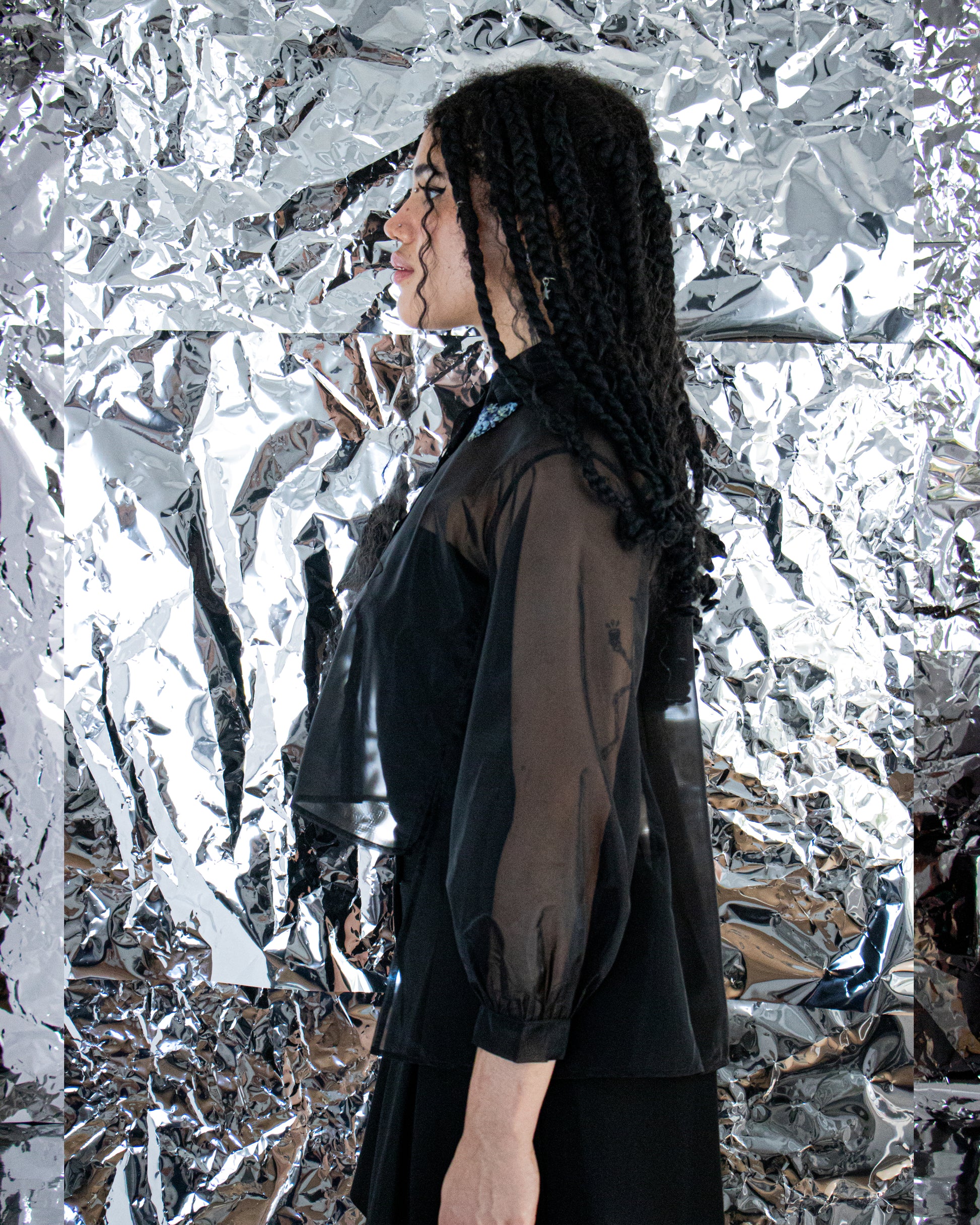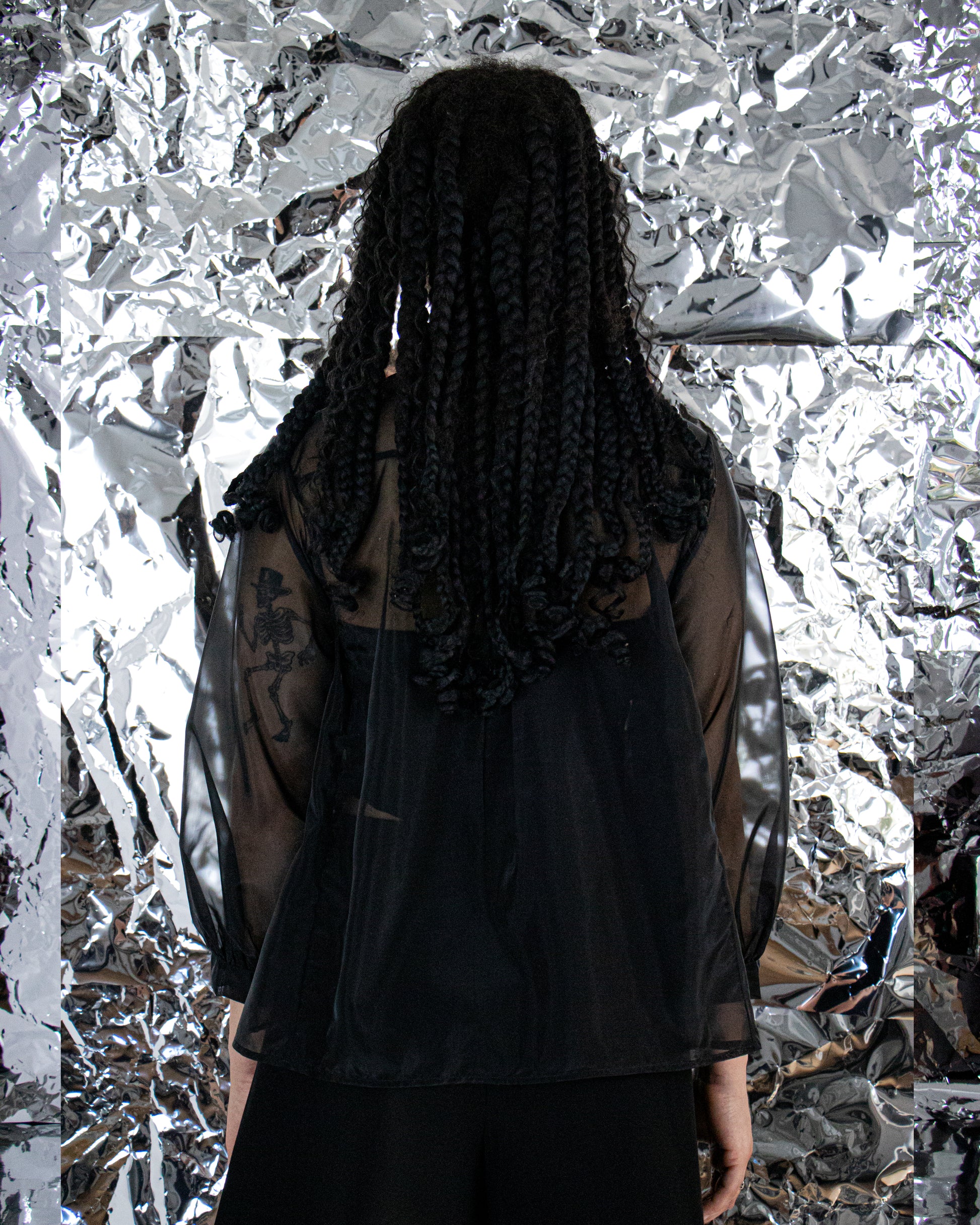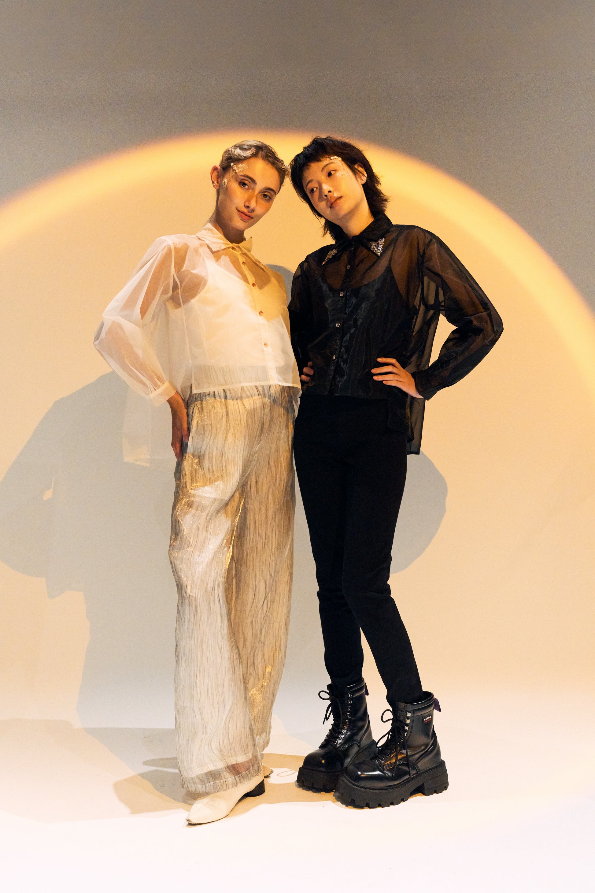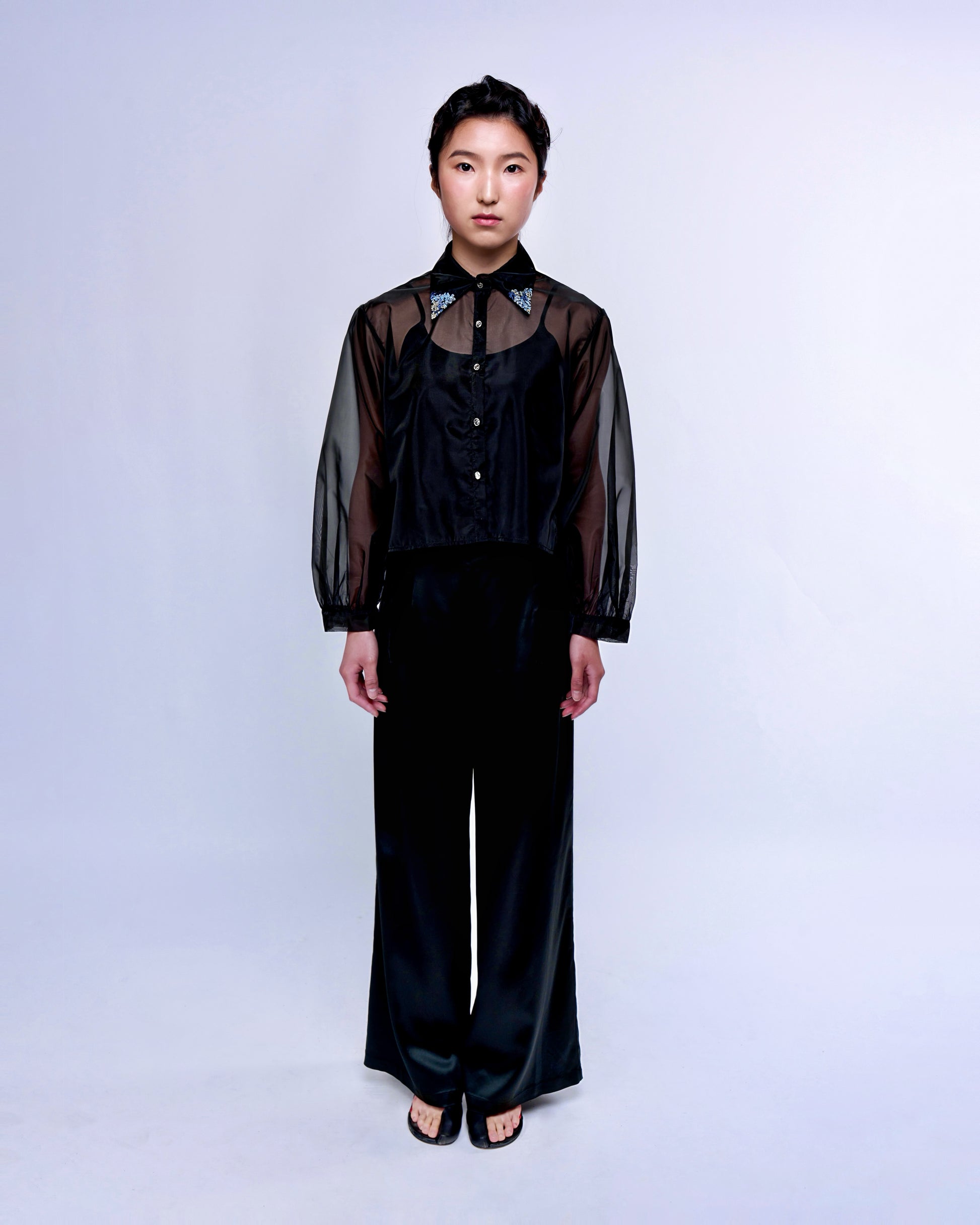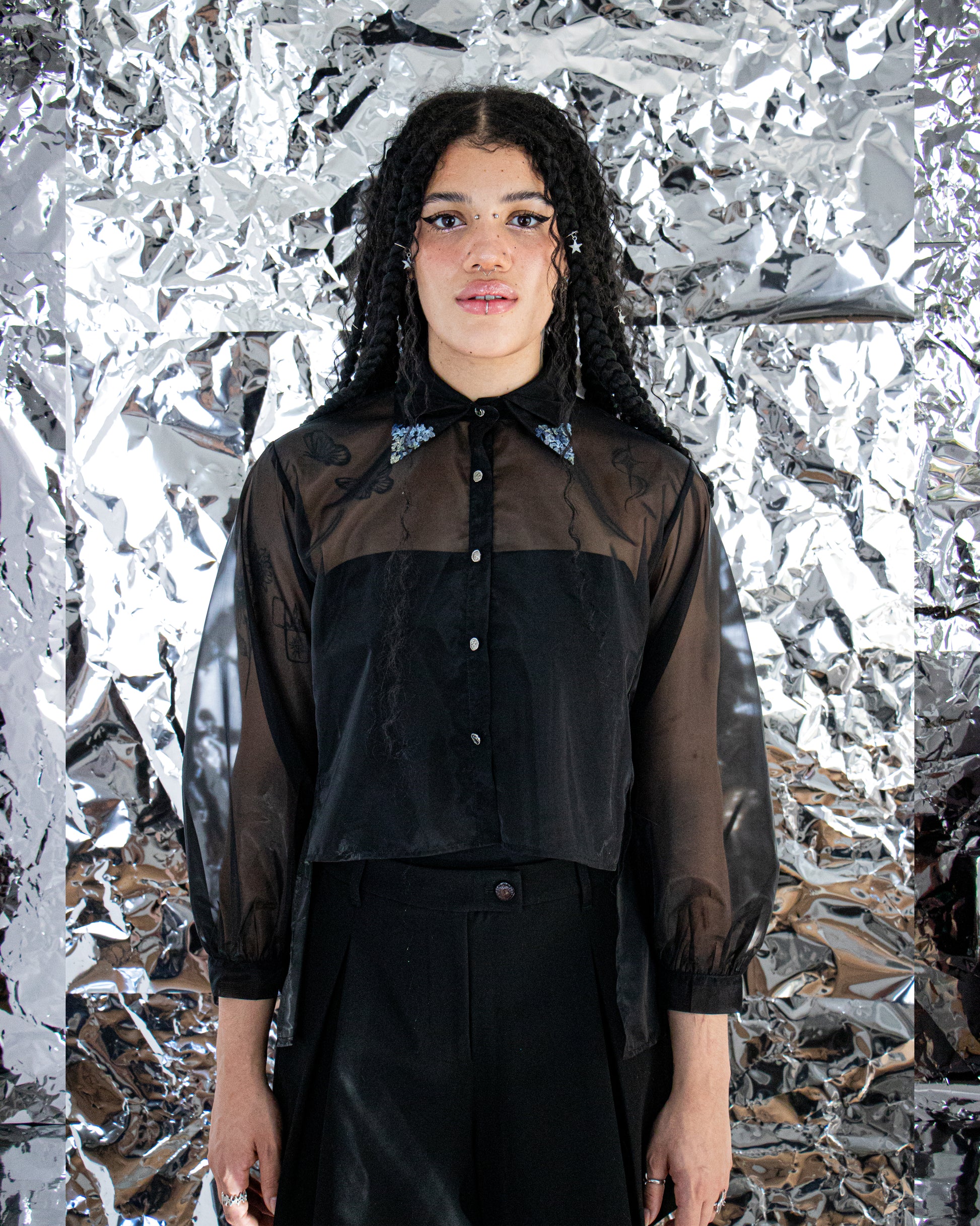 This shirt features a modern silhouette with a slightly cropped front and a longer back, creating a flattering and dynamic look. The voluminous sleeves with gently gathered cuffs contribute to the blouse's romantic silhouette, making it an ideal piece for those who appreciate a combination of modern design and timeless craftsmanship. Perfect for both casual and formal settings, this organza blouse is a versatile addition to any fashion-forward collection.