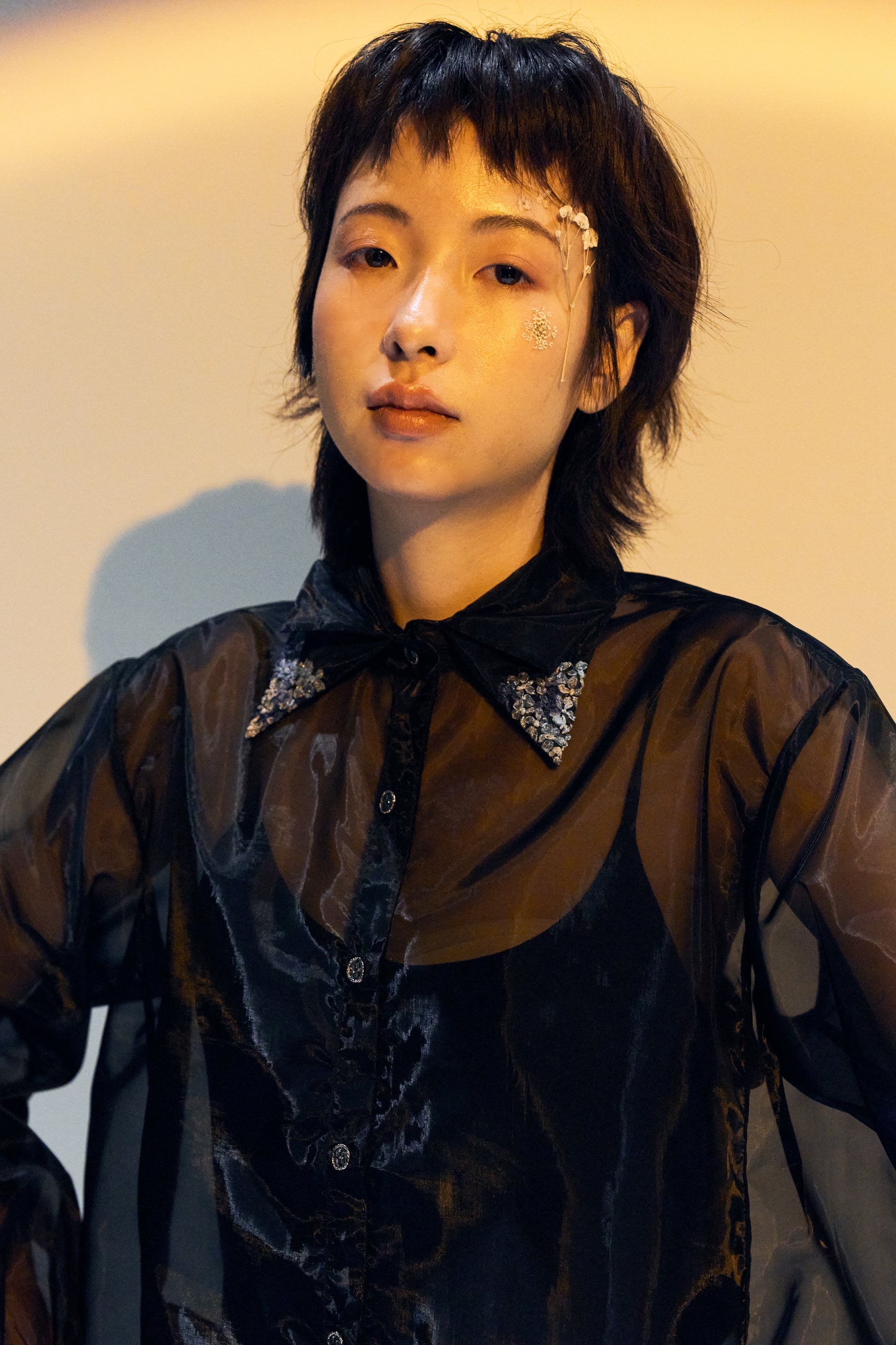 The collar is adorned with delicate floral embroidery, made using traditional French silk ribbon techniques. These pastel blooms add a subtle yet enchanting detail, perfectly capturing the essence of spring. The blouse also features bespoke, jewelry-like buttons in a soft pink hue, complementing the embroidered accents and adding a refined touch of luxury.