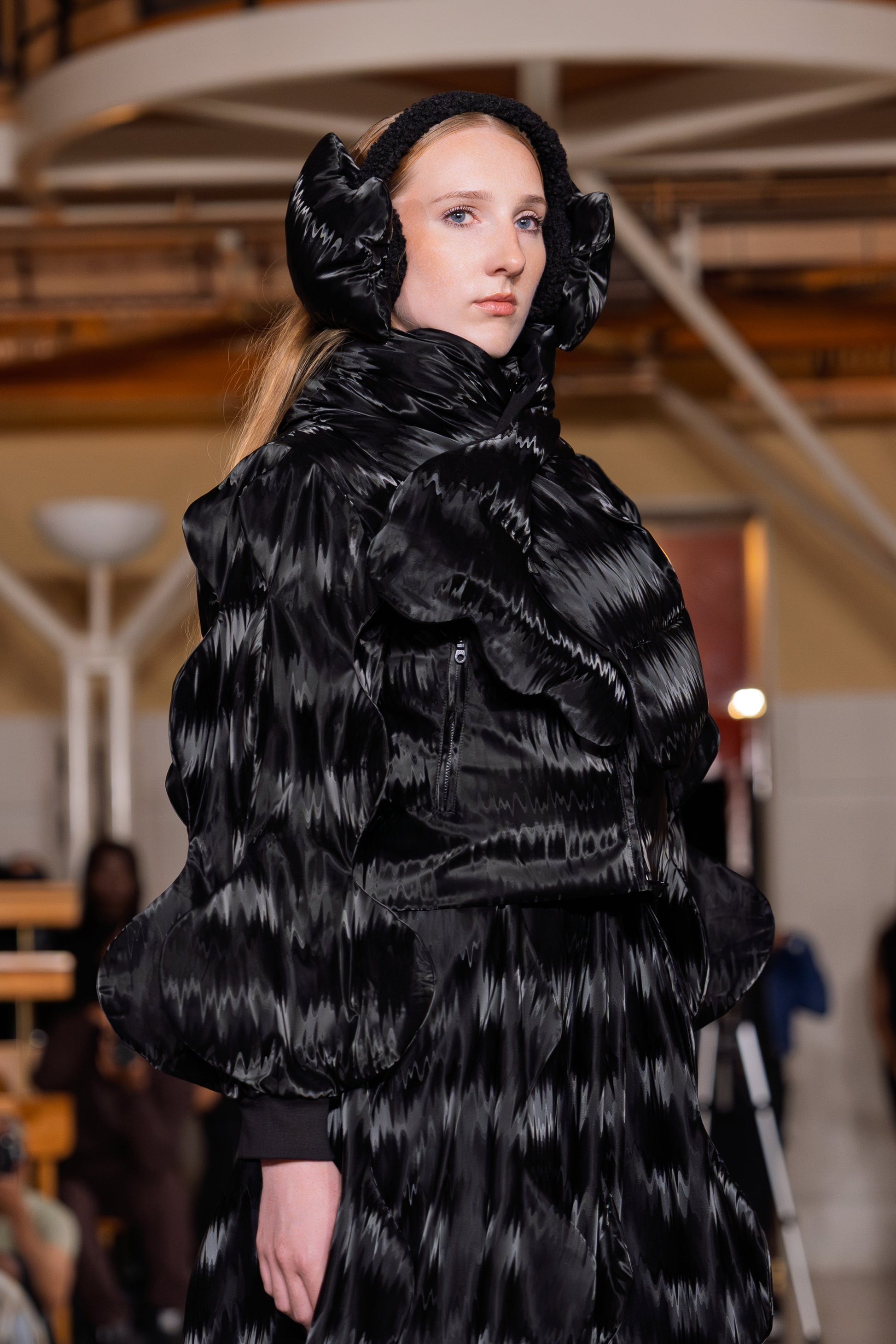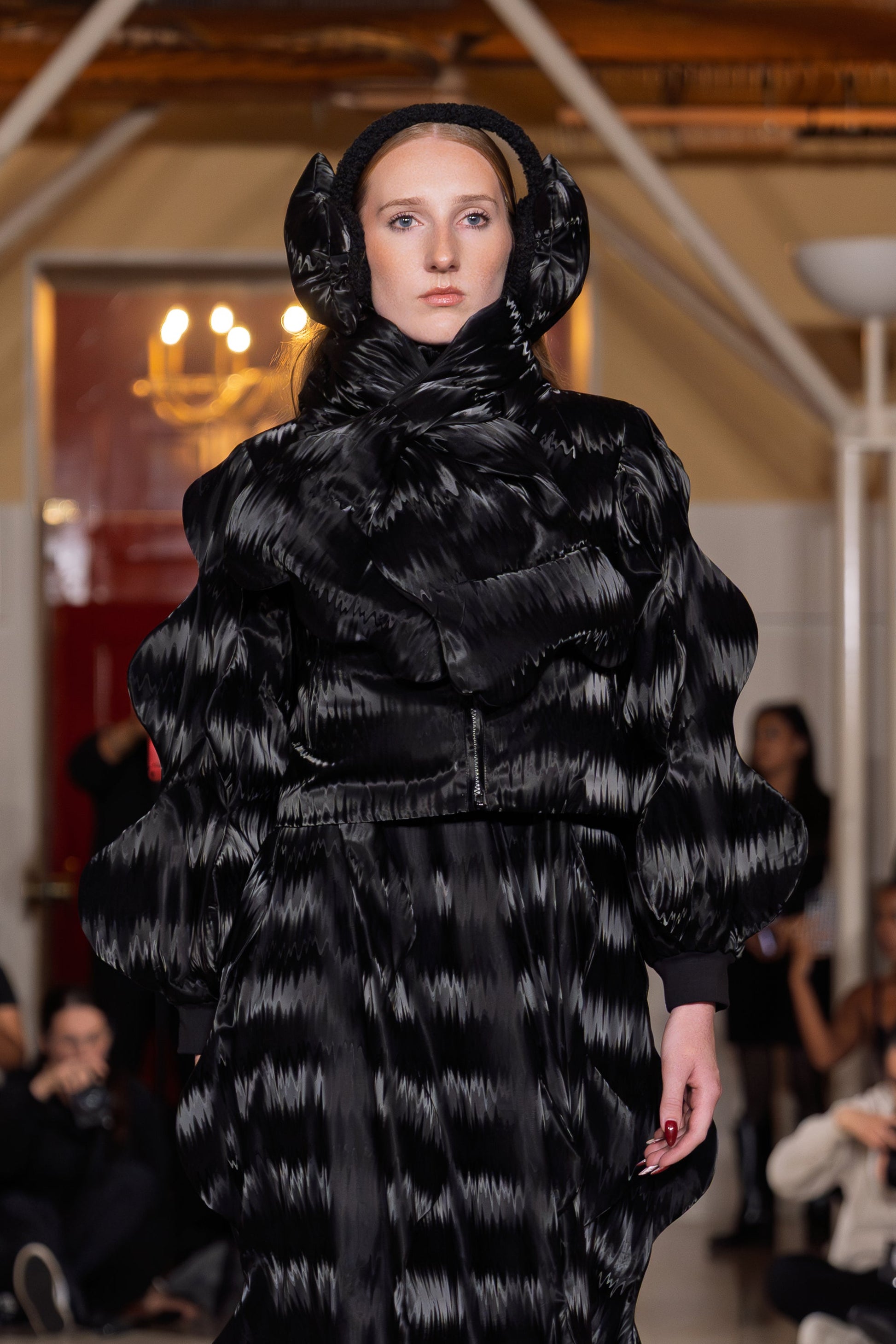 A sculptural winter coat crafted from a high-gloss technical shell and filled with premium duck down. This piece amplifies volume through exaggerated wave-cut panels and an inflated silhouette that wraps around the body like protective architecture. Despite its dramatic form, it remains lightweight and wearable — merging function and avant-garde presence.